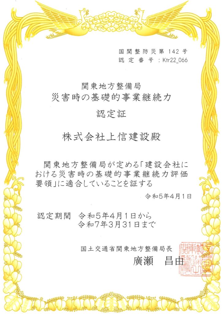 BCP(事業継続計画)とは、災害や事故などの発生に備え、企業が事業継続を確保するための計画です。BCP取得には、事業上のリスクの評価、災害時の対応策の策定、システムや施設のバックアップ、人材の配置などが含まれます。BCPを取得することで、災害発生時にも顧客や取引先へのサービス提供が継続できるだけでなく、企業の信頼性や競争力を高めることができます。また、BCPは法的な規制に準拠することが求められる場合があります。わが社も不測の事態に対処するためにBCPを取得しました。